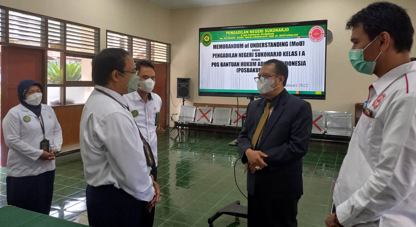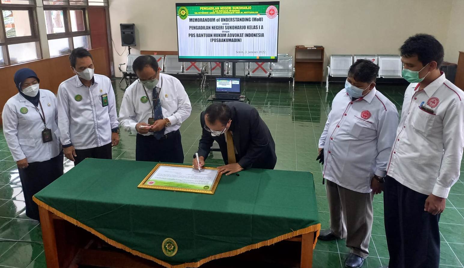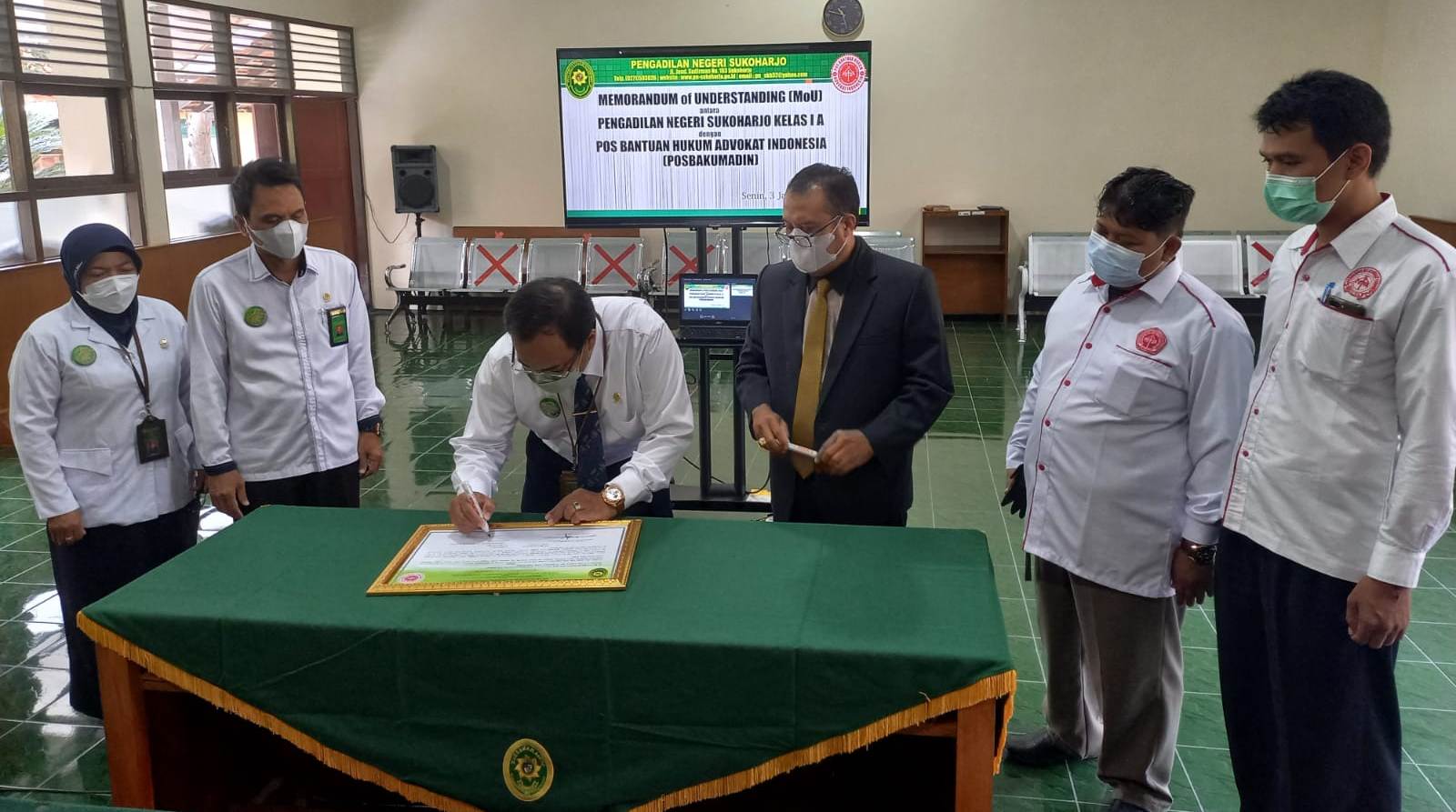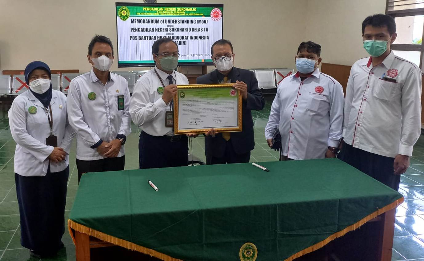 Sukoharjo (Varia Advokat), 04 Januari 2022 – Pada hari Senin tanggal 3 Januari 2022 POSBAKUMADIN Sukoharjo telah menandatangani MoU terkait Pelayanan POSBAKUM (Pos Bantuan Hukum) dengan Pengadilan Negeri Sukoharjo Pada hari Senin tanggal 3 Januari 2022, POSBAKUMADIN Cabang Sukoharjo sudah 5 kali bermitra dengan Pengadilan Negeri Sukoharjo ujar (Advokat Bambang Triyono S.Sy).