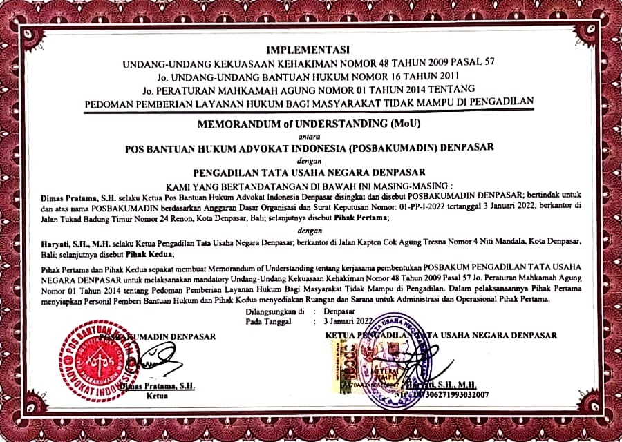 Denpasar (Varia Advokat), 10 Januari 2022 – Telah dilaksanakan Penandatanganan MoU antara Pengadilan Tata Usaha Negara Denpasar dengan POSBAKUMADIN Denpasar, Sebagai wujud Implementasi Undang-Undang Bantuan Hukum No.16 Tahun 2011.