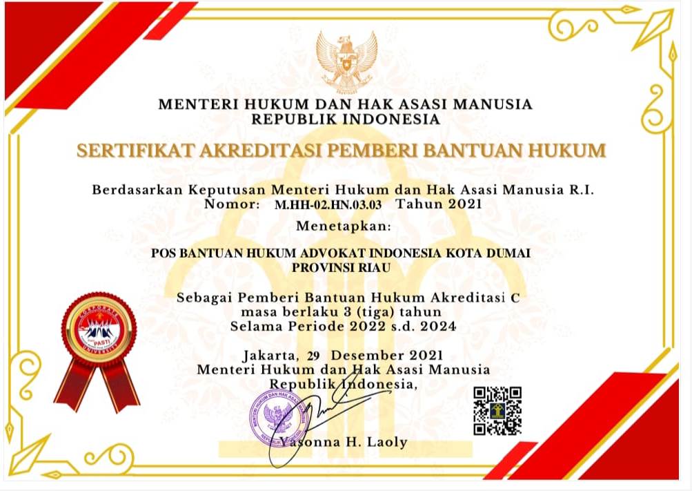 Dumai (Varia Advokat), 10 Januari 2022 – POSBAKUMADIN Dumai mengikuti VERASI (Verifikasi & Akreditasi) OBH 2021 pada Akhir tahun 2021 dinyatakan Lulus oleh KEMENTERIAN HUKUM & HAM R.I. kemudian setelah melalui proses POSBAKUMADIN Dumai melaksanakan MoU dengan Pengadilan Negeri Dumai Kelas 1-A dengan tepatnya pada Hari Senin 10 Januari 2022 Pukul. 14:00 WIB di Ruangan Mediasi Pengadilan Negeri Dumai.