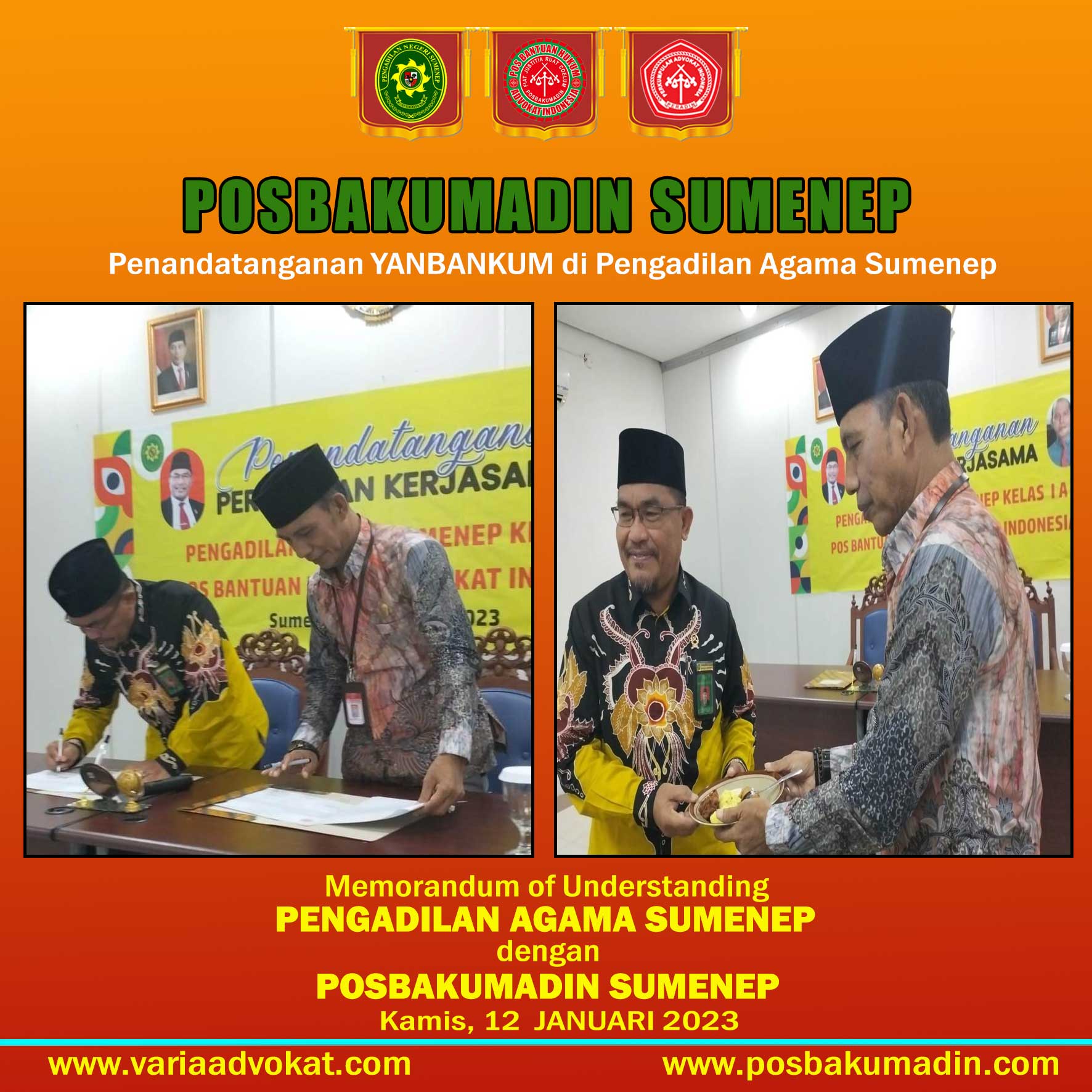 Sumenep (Varia Advokat), 12 Januari 2023 – Kamis, 12 Desember 2023 POSBAKUMADIN Sumenep Melaksankan Penandatanganan Kerjasama Dengan Pengadilan Agama Sumenep yang Ke-2 kalinya. Acara Berlangsung di Ruang Pengadilan Agama Sumenep dan dihadiri oleh Ketua Pengadilan Agama Sumenep Bapak Drs. Palatua, SH.MHI. serta Ketua POSBAKUMADIN Sumenep Advokat Agus Suprayitno, SH.