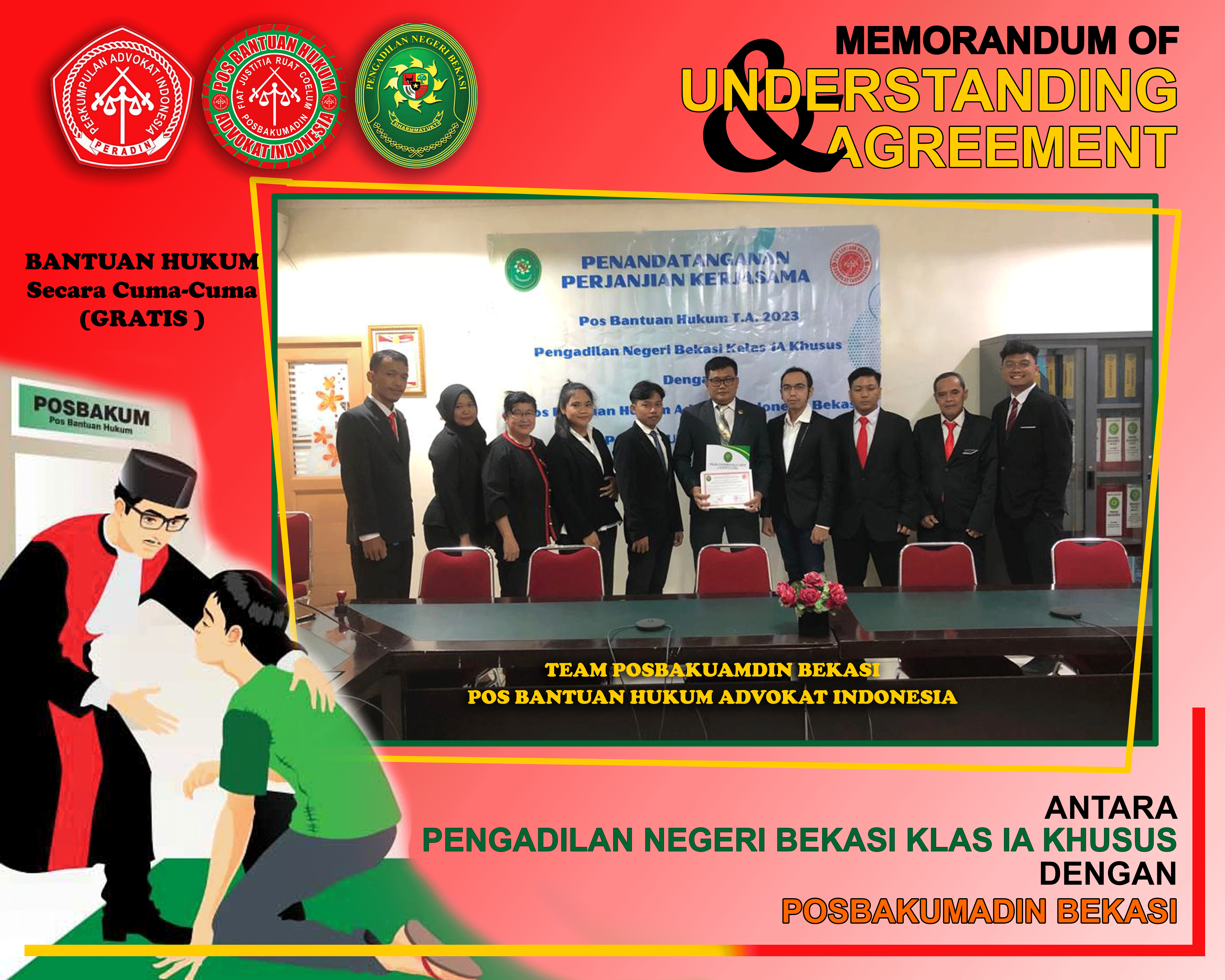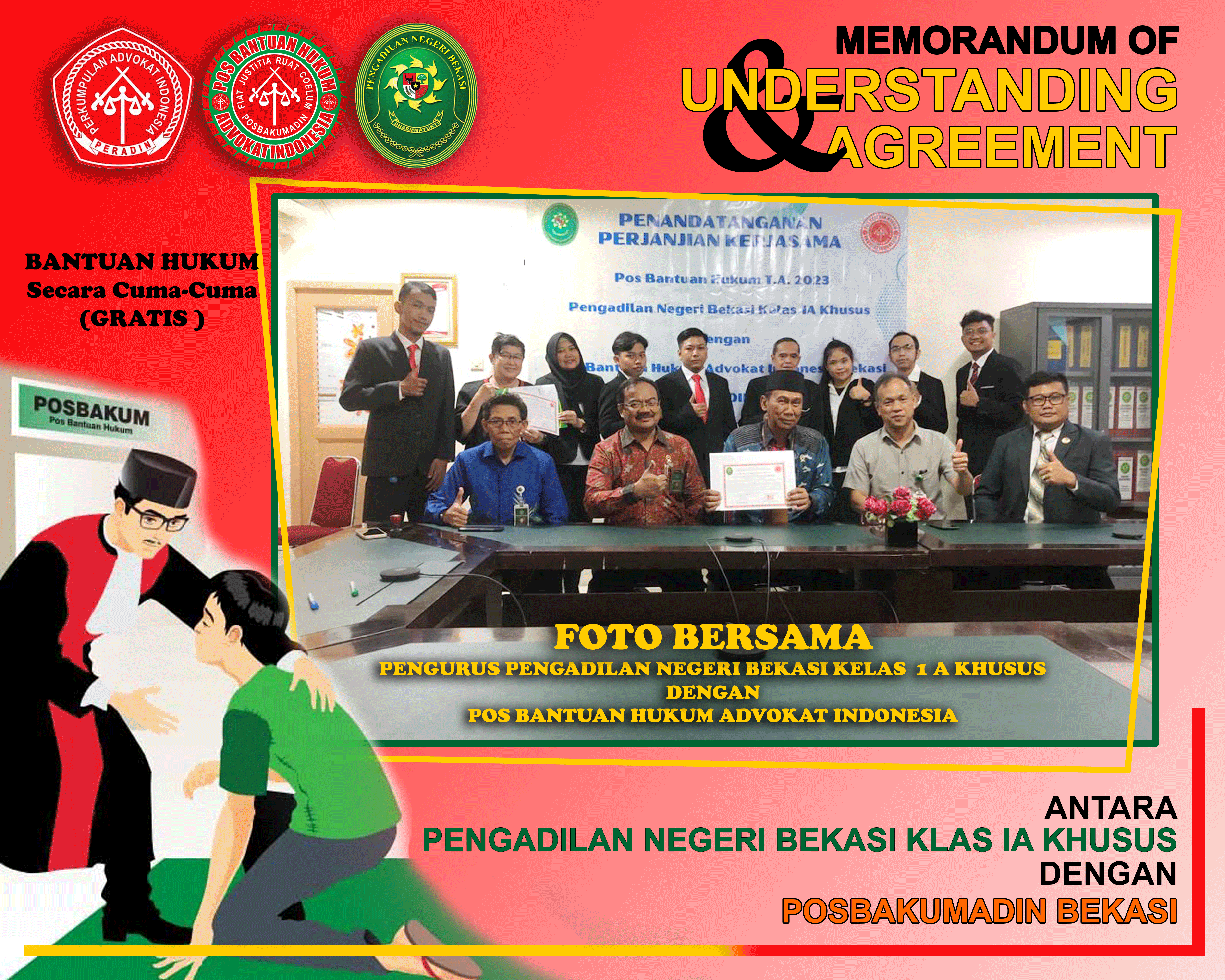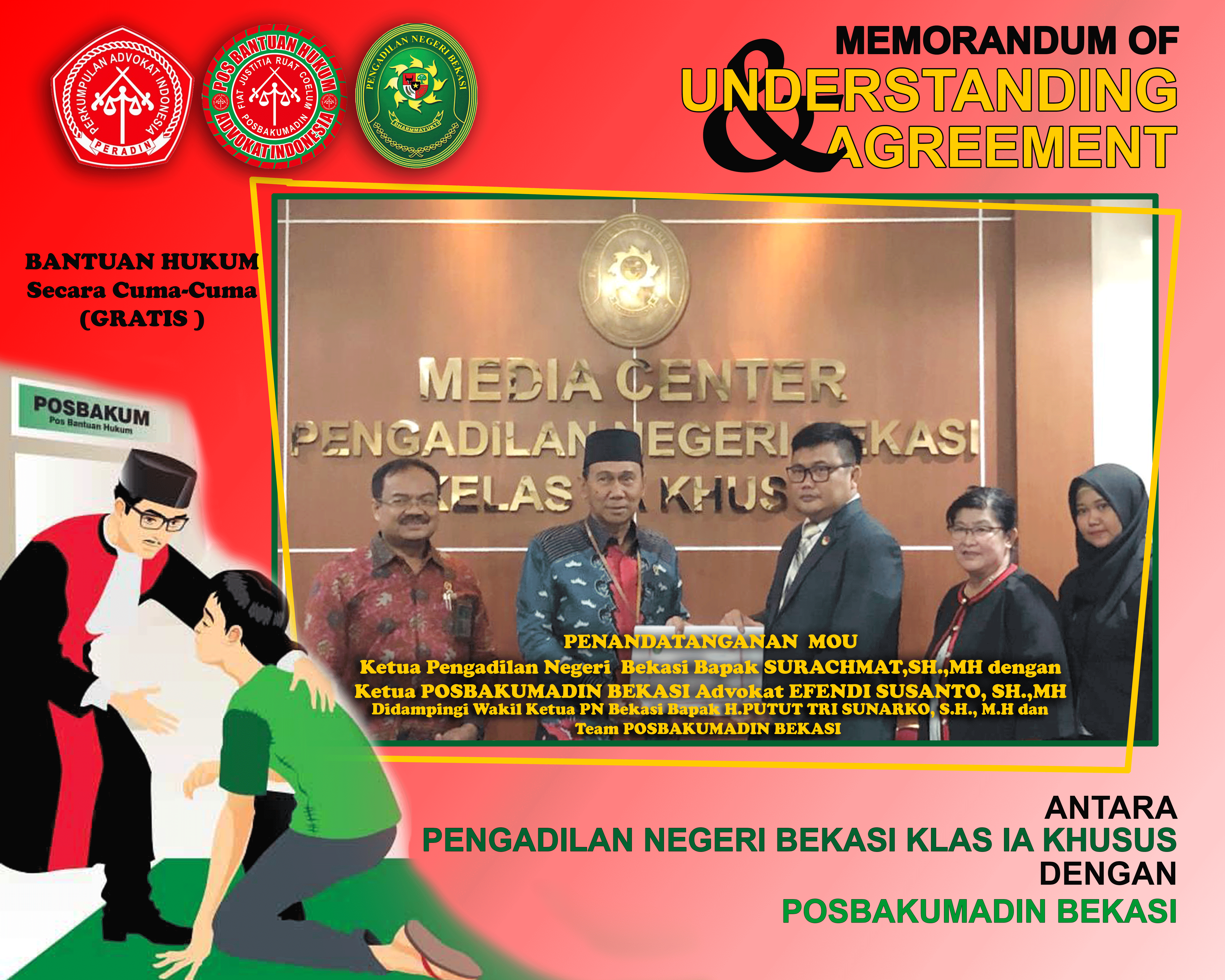 Penandatanganan MoU antara Pengadilan Negeri Bekasi Kelas IA Khusus dengan POSBAKUMADIN Bekasi di tandatangani langsung oleh Ketua Pengadilan Negeri Bekasi Bapak SURACHMAT SH.MH didampingi Wakil Ketua H. PUTUT TRI SUNARKO, SH.MH dan untuk POSBAKUMADIN Bekasi oleh Advokat EFENDY SANTOSO, SH.MH selaku Ketua, untuk memenuhi PERMA No 1 Tahun 2014 yang berisi tentang adanya POSBAKUM (Pos Bantuan Hukum) pada Pengadilan.