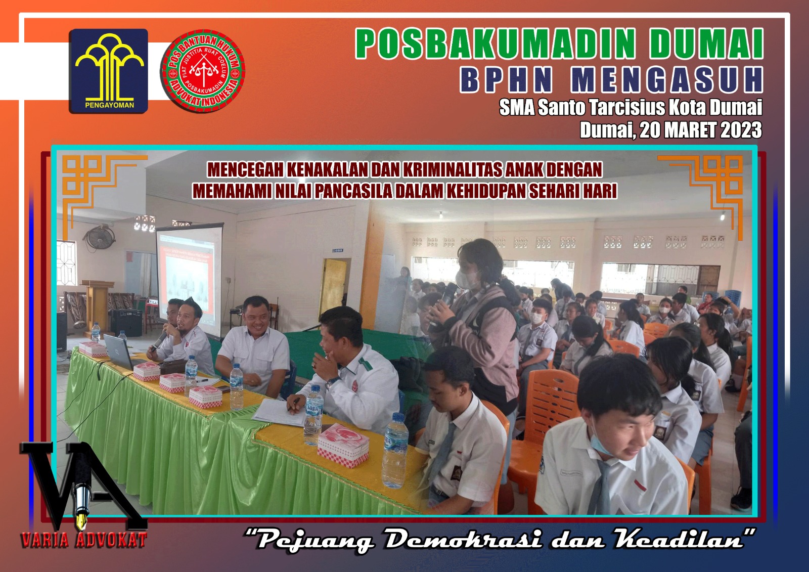 Dumai (Varia Advokat), 20 Maret 2023 – Dalam upaya menjalankan program BPHN Mengasuh dengan tema “Mencegah Kenakalan dan Kriminalitas Anak Dengan Memahami Nilai Pancasila Dalam Kehidupan Sehari-hari”, POSBAKUMADIN KOTA DUMAI melaksanakan kegiatan penyuluhan hukum di SMA Santo Tarcisius Kota Dumai pada Senin 20 Maret 2023.