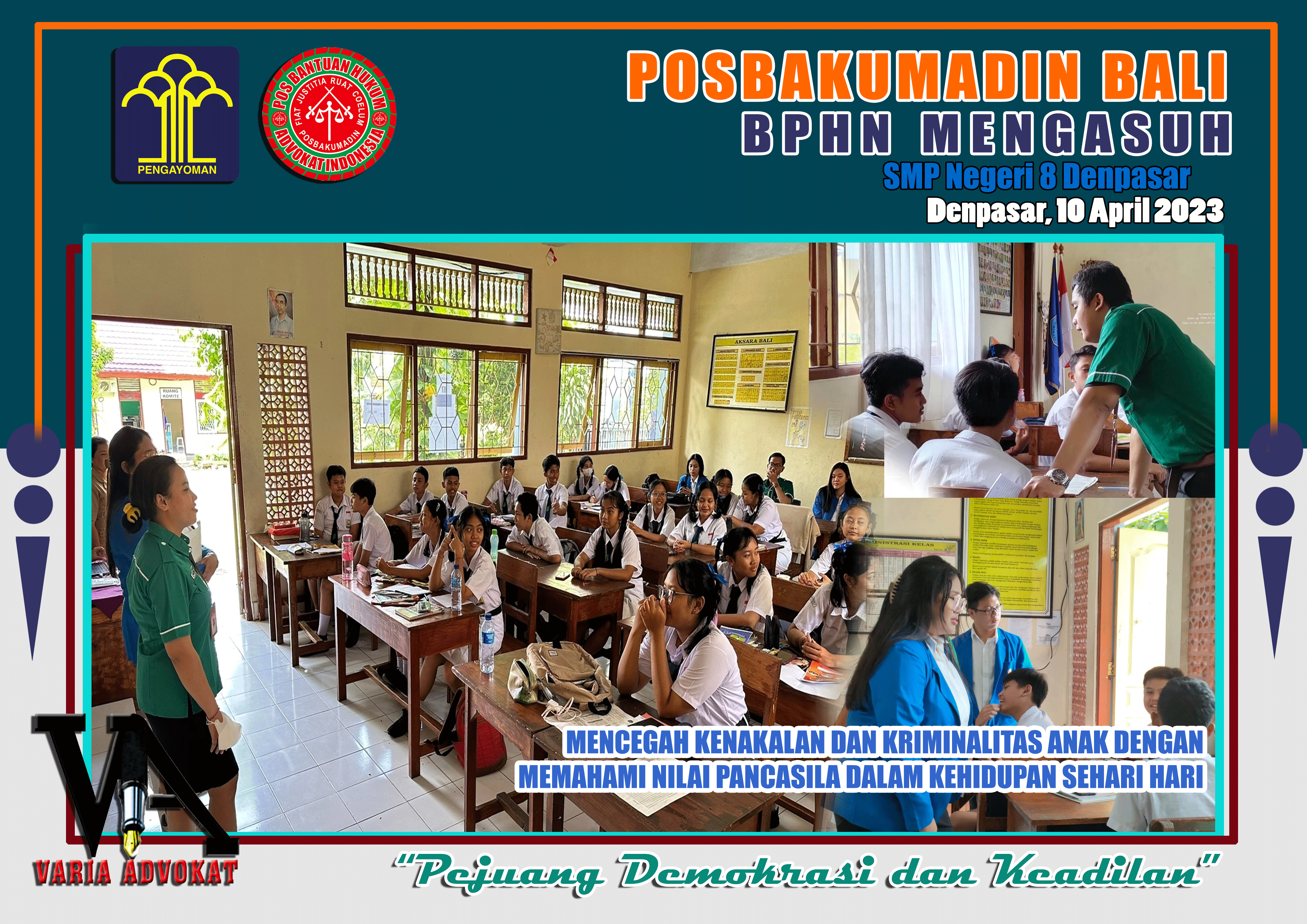 Denpasar (Varia Advokat), 10 April 2023 – POSBAKUMADIN BALI terus bergeliat dengan agenda yang sama hari ini Senin tanggal 10-04-2023, untuk menyukseskan program BPHN MENGASUH telah terlaksana juga Penyuluhan Hukum Gratis bertajuk “BELAJAR HUKUM DAN MEMAKNAI NILAI-NILAI PANCASILA” pada siswa-siswi Sekolah Menengah Pertama Negeri 8 Denpasar.