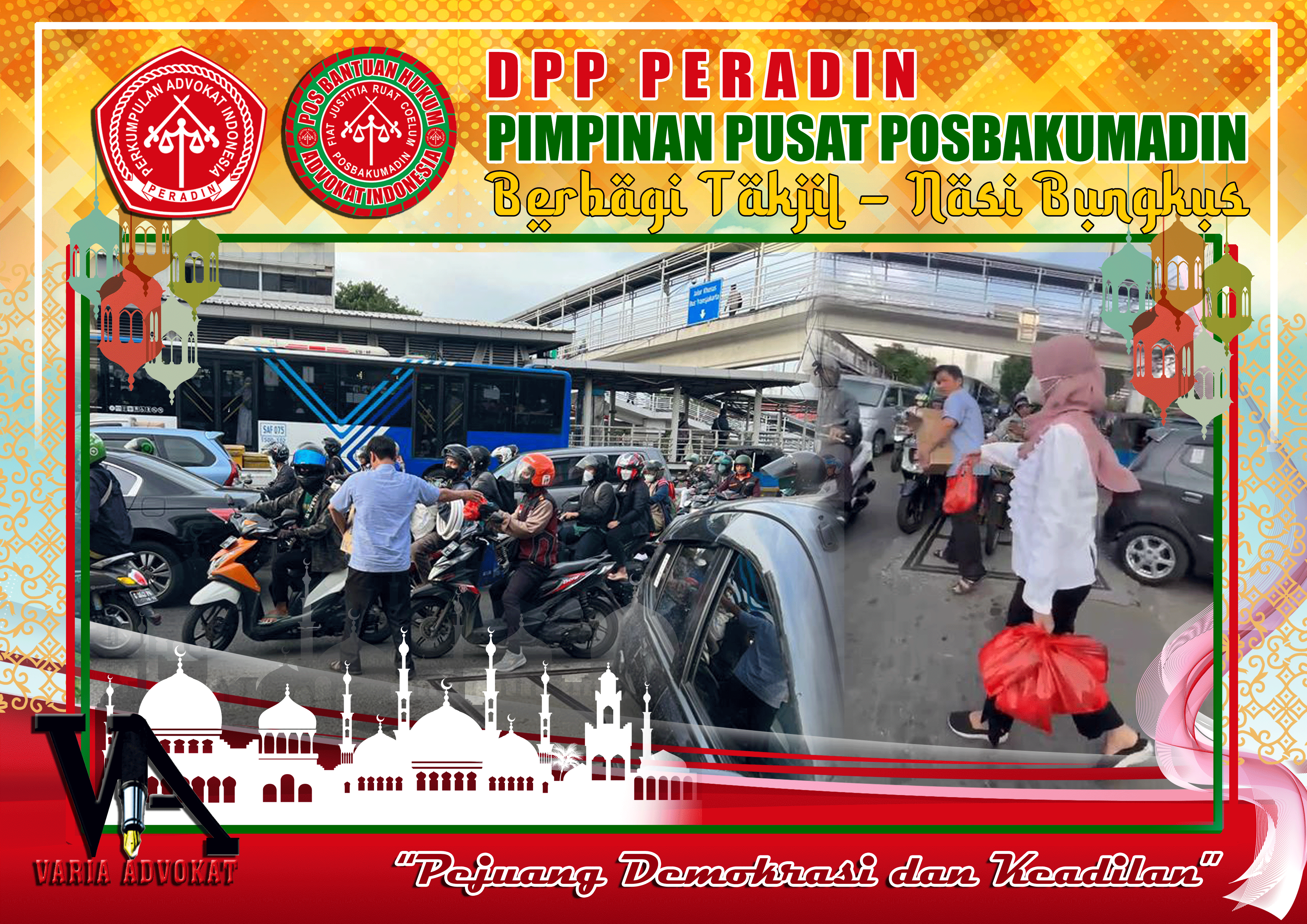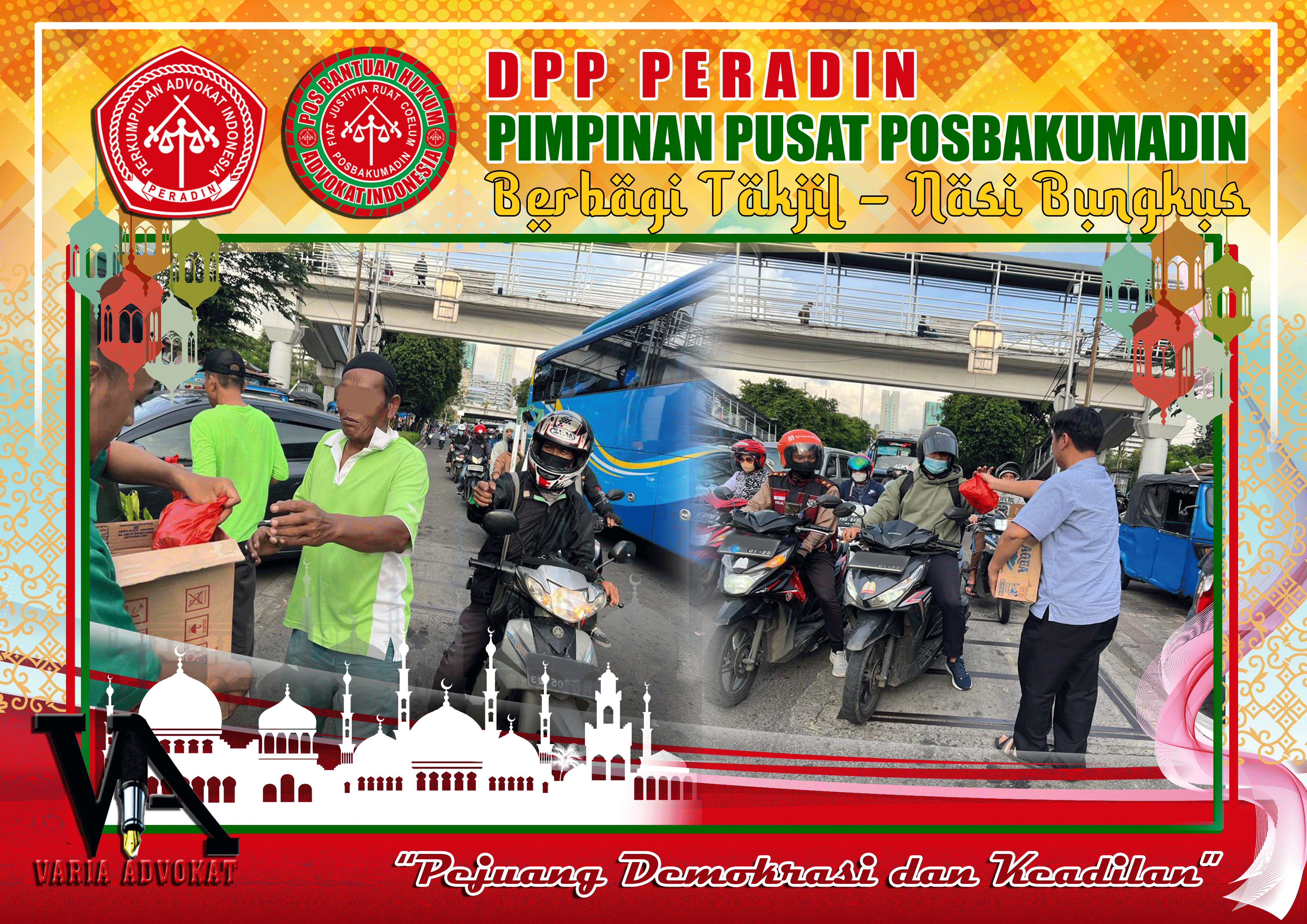 Bertempat di depan kantor DPP PERADIN, para anggota membagikan takjil kepada para pengguna jalan yang melintas. Advokat Halim Jeverson Rambe, Advokat Gito Indrianto Rambe, SH.MH, Advokat Sri Nuryati, SH, Advokat Oki Mandala Saputra, SH, Advokat Muhamad Ismail Adam, SH.MH, Haisyah Febriyanti dan Anggota lainnya.