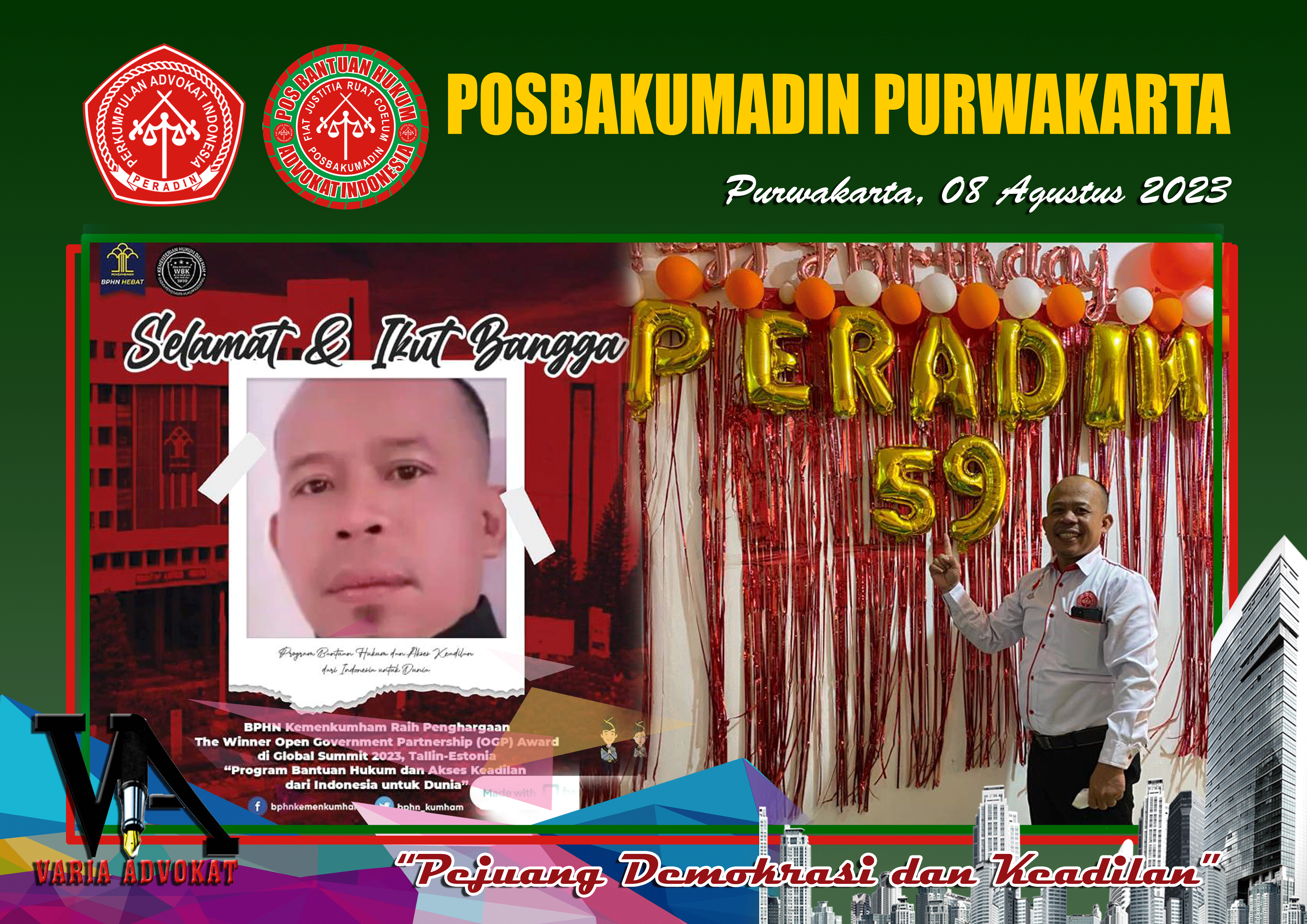 POSBAKUMADIN Purwakarta yang dinahkodai Advokat Supriyadi, SH.,MH mengucapkan Selamat dan Ikut Bangga atas penghargaan yang di raih oleh Badan Pembinaan Hukum Nasional Bapak Prof. Dr. Widodo Ekatjahjana, S.H., M.Hum. Dan untuk masyarakat wilayah Purwakarta khusunya yang membutuhkan bantuan hukum dapat datang ke kantor POSBAKUMADIN yang bertempat di kantor Pengadilan Negeri Purwakarta. tutur Advokat Supriyadi.