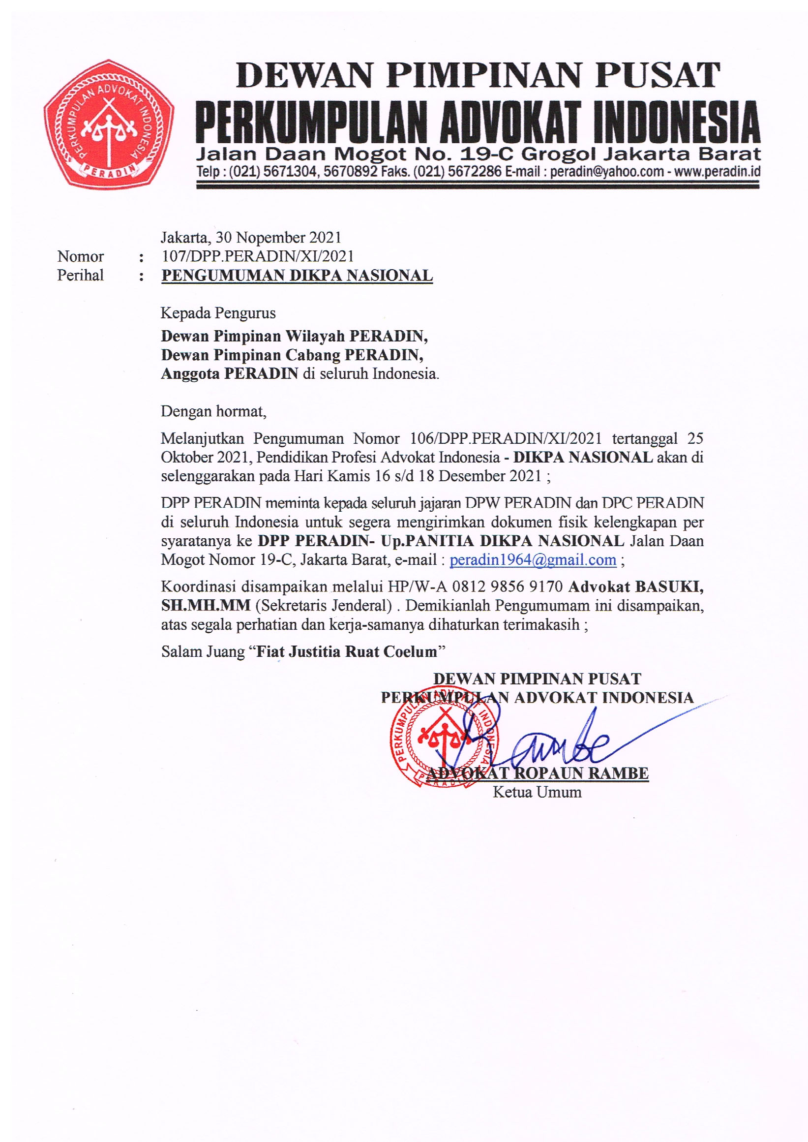 DPP PERADIN meminta Kepada seluruh jajaran DPW PERADIN dan DPC PERADIN di seluruh Indonesia untuk segera mengirimkan dokumen fisik kelengkapan persyaratannya ke DPP PERADIN- Up. PANITIA DIKPA NASIONAL Jalan Daan Mogot Nomor 19-C, Jakarta Barat, e-mail : peradin1964@gmail.com ; Koordinasi disampaikan melalui HP/WhatsApp 0812 98569170 Advokat BASUKI, SH.MH.MM (Sekretaris Jenderal).